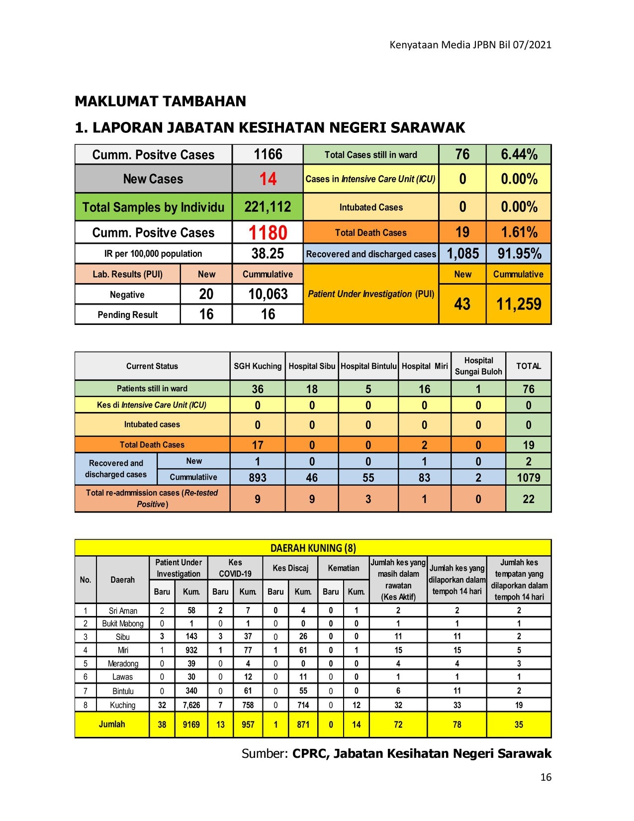 Sarawak has reported a total of 1,180 positive cases since the start of the pandemic and 1,085 have recovered and discharged so far. Unfortunately, there are a total of 19 deaths recorded. The recovery rate in the state is 91.95% and the mortality rate is 1.61%.