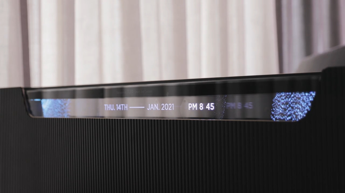 No, this isn’t a bed that uses technology to help you sleep, despite its name. The LG SMart Bed comes with a built-in 55″ Transparent OLED display that sits in the frame at the foot of the bed, and at a touch of a button, the display rises from its previously-hidden location to provide you with some morning/evening entertainment, as well as some insights on your night of sleep.