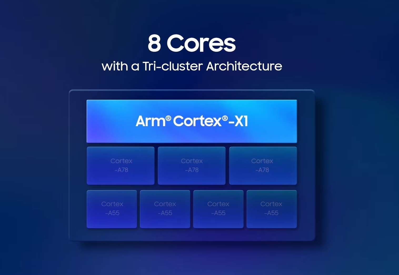 According to Samsung, the switch from 7nm to 5nm EUV provides a 10% boost in power and 20% reduction in power consumption. The CPU features 8-cores with a Tri-cluster architecture. It features a single powerful ARM Cortex-X1 core which does the most heavy lifting and it’s clocked up to 2.9GHz.