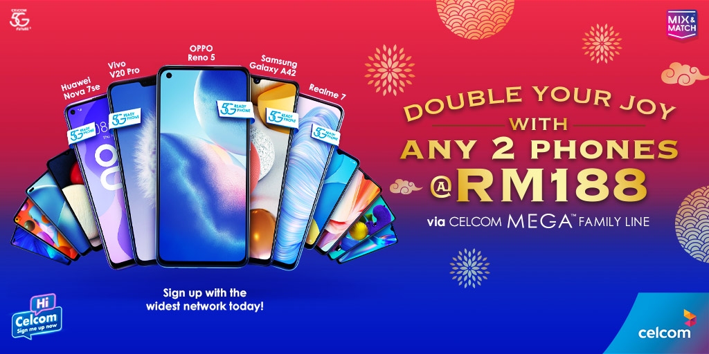 For postpaid users on Celcom MEGA postpaid Family Lines, you can get two smartphones from as low as RM188 on contract. They offer a total of 14 different options including 5G models to choose from which include the Realme 7, Huawei Nova 7 SE, Oppo Reno 5 and Samsung Galaxy A42. You can learn more about the double device combo here.