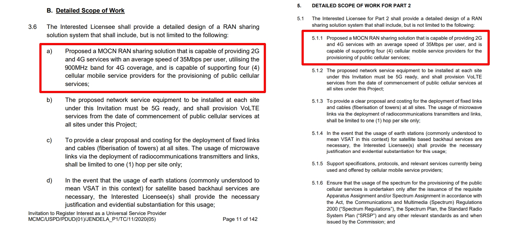 Based on the original RFP that was released in November last year, 900MHz spectrum was listed as a requirement. This would limit participation to just 4 telcos – Celcom, Digi, Maxis and U Mobile. The requirement has been removed in the updated invitation and this would allow more licensees to participate. In addition, telcos would be free to utilise various spectrum to provide coverage in rural areas.
