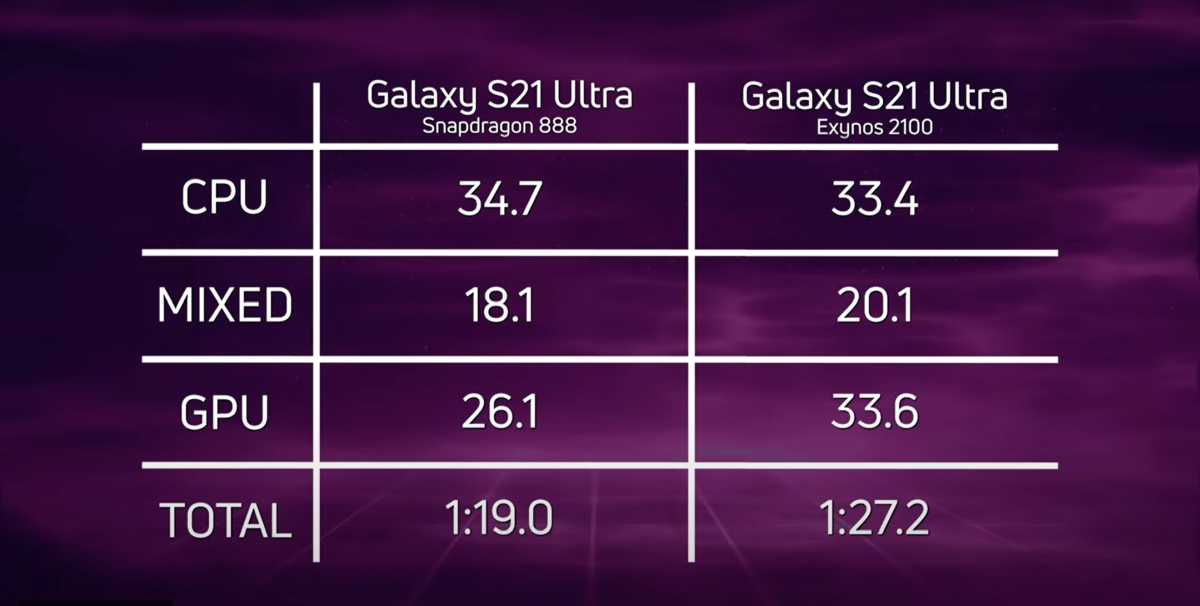 As you can see in the table above, the Snapdragon 888 version generally performed better than the Exynos 2100-powered S21 Ultra—particularly for the mixed and GPU-only tests. As a result, the overall performance (in terms of speed) of Qualcomm’s chip in the Galaxy S21 Ultra has the upper hand over its Exynos counterpart.