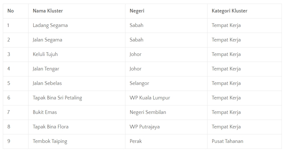 The MInistry of Health has identified 9 new clusters today. This include Ladang Segama and Jalan Segama clusters in Sabah, Keluli Tujuh and Jalan Tengar clusters in Johor, Jalan Sebelas cluster in Selangor, Sri Petaling construction site cluster in Kuala Lumpur, Bukit Emas cluster in Negeri Sembilan, Flora construction site cluster in Putrajaya and Tembok Taiping cluster in Perak.