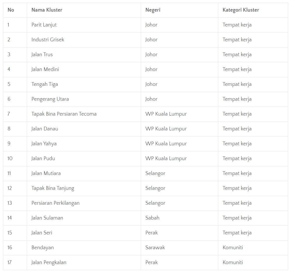 The Ministry of Health has identified 17 new clusters and below is the full list: