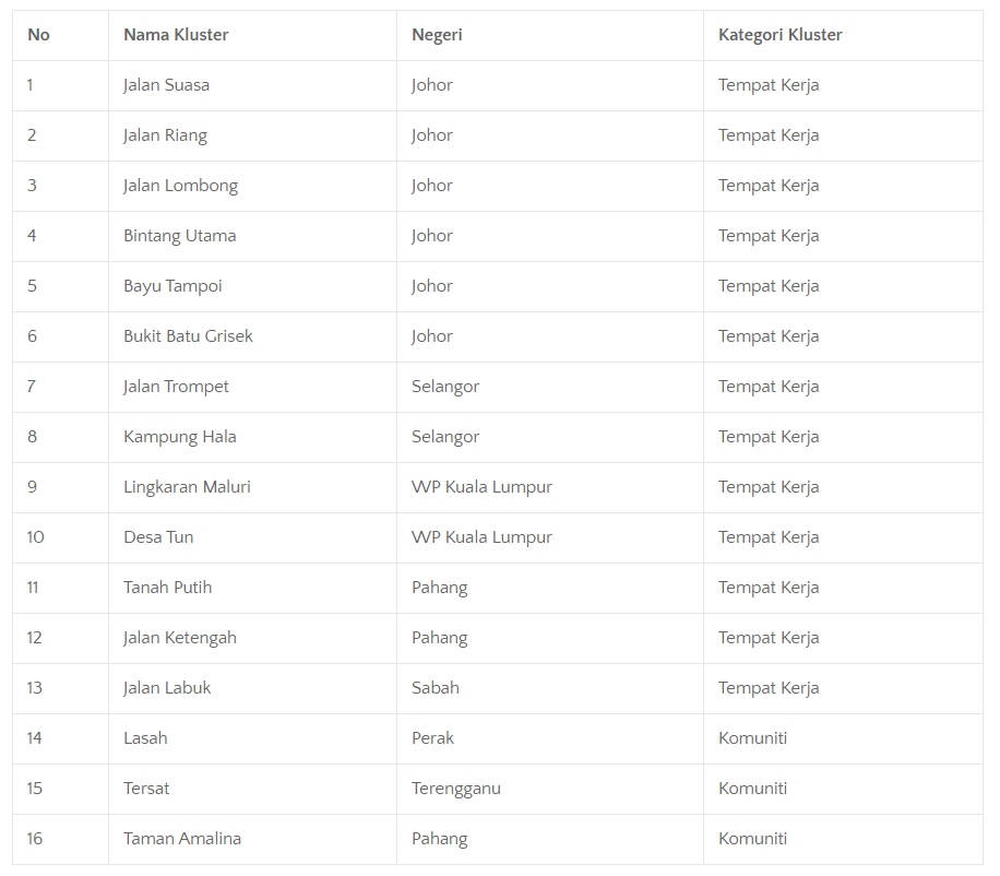 The Ministry of Health has identified 16 new clusters and 13 of them are workplace related. Below is the full list: