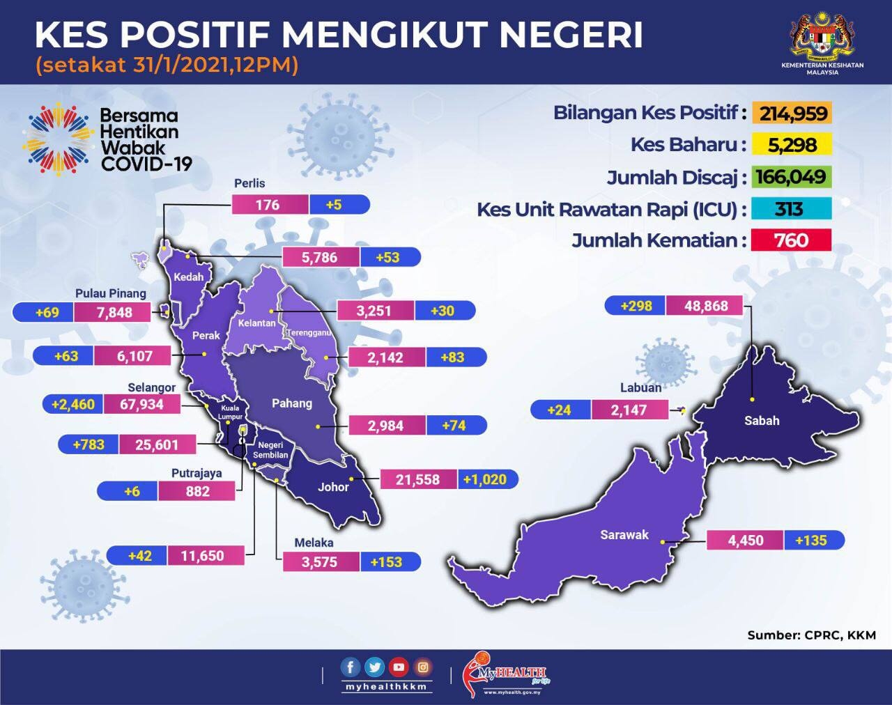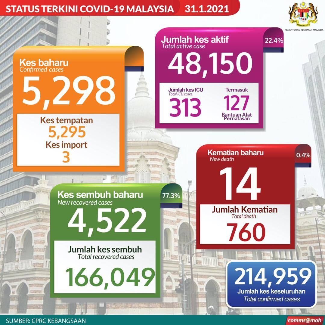 Malaysia has recorded 5,298 new COVID-19 cases today which brings the total number of infections to 214,959. There are 14 new deaths reported and the death toll is now 760.