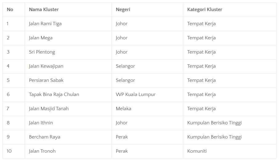 The Ministry of Health has identified 10 new clusters today and 7 of them are workplace related. Below is the full list: