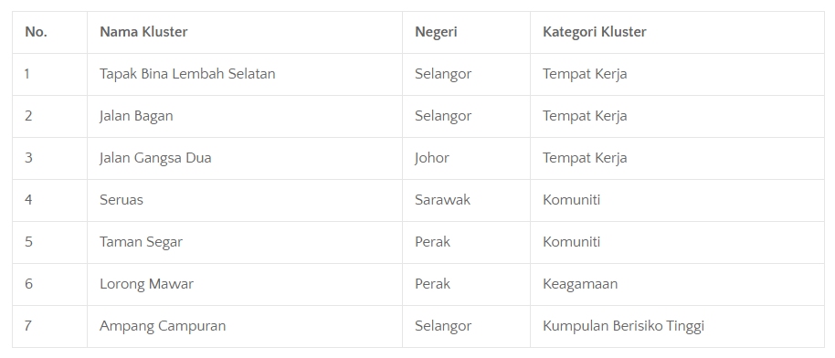 A total of 81 active clusters have recorded new cases today. The Industri Serkam cluster recorded the most with 246 new cases, followed by Gudang Salak Tinggi cluster with 127 new cases and Lembah Selatan construction site cluster with 99 new cases.