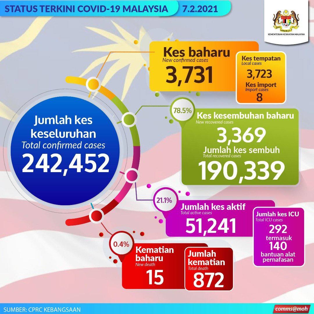 Malaysia has recorded 3,731 new COVID-19 cases today which brings the total number of infections to 242,452. There are 15 new deaths reported and the death toll is now 872.
