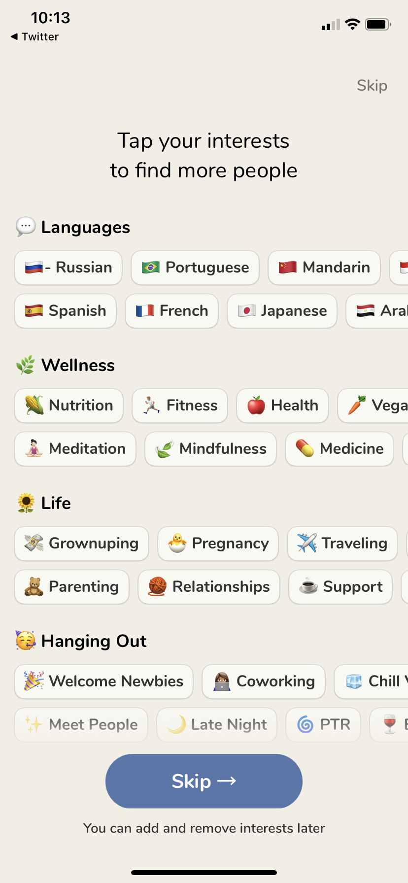 Once you’ve gotten yourself into Clubhouse, you can choose several interests to help you find people to follow (or to skip it entirely). You can also add people based on your phone list.
