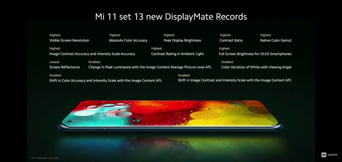 The Xiaomi Mi 11 is awarded the best smartphone display title by DisplayMate and it sets 13 new DisplayMate Records. This include highest peak display brightness, highest contrast ratio, highest native colour gamut and highest full screen brightness for OLED smartphones.