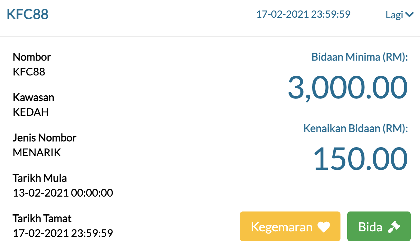All you fried chicken fans can get in on the bids for KFC car registration plates by 11.59pm 17 February 2021. Some of the more sought-after KFC plates have a minimum bid of RM20,000.