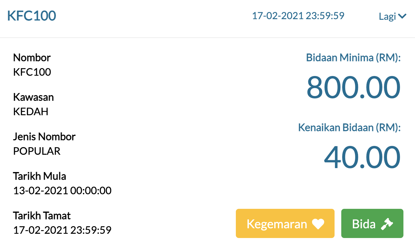 Once you’ve logged in, you’ll be able to search for your preferred car plate number (example: 10, 800, 5) by clicking on “Cari Nombor”. Once you’ve searched for your number, you’ll be able to see the car plates’ minimum bids. So, for example, the car plate number KFC100 has a minimum bid of RM800, whereas KFC8 has an insane minimum bid of RM20,000.