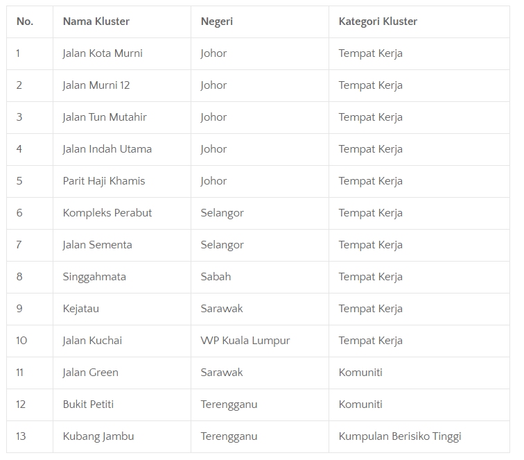 The Ministry of Health has identified 13 new clusters and 10 are workplace related. Here’s the full list of newly identified clusters: