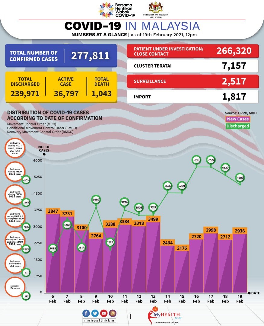 Malaysia has recorded 2,936 new COVID-19 cases today which brings the total number of infections to 277,811. There are 13 new deaths reported and the death toll is now 1,043.