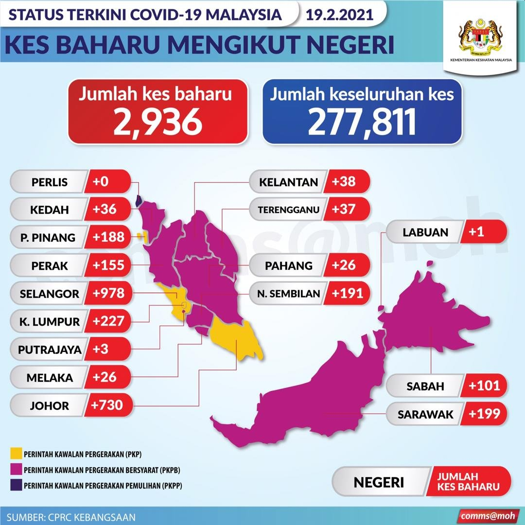 Out of the 2,936 new cases today, 17 are imported while 2,919 are transmitted locally. Selangor recorded the most with 978 cases, followed by Johor with 730 cases, Kuala Lumpur with 227 cases and Sarawak with 199 cases.