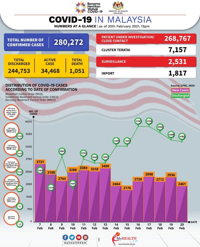 Malaysia has recorded 2,461 new COVID-19 cases today which brings the total number of infections to 280,272. There are 8 new deaths reported and the death toll is now 1,051.