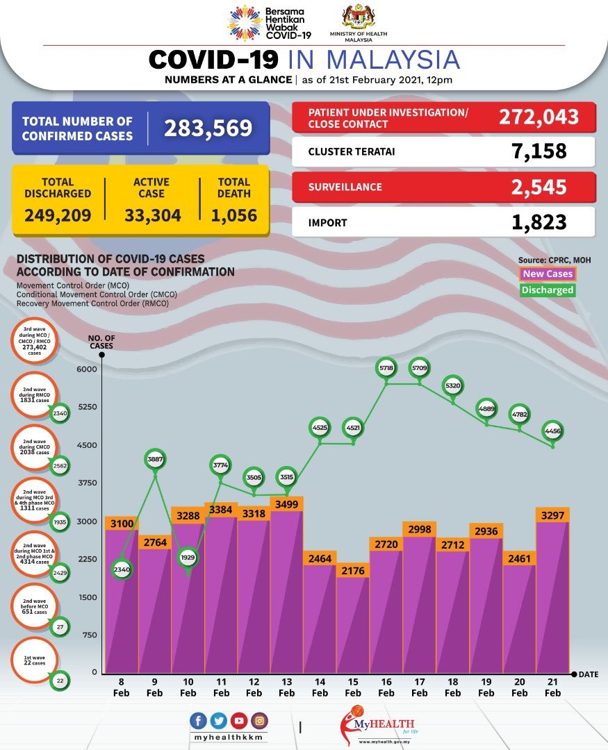 Malaysia has recorded 3,297 new COVID-19 cases today which brings the total number of infections to 283,569. This is marks a new surge after 7 days of reporting less than 3,000 new cases daily. There are 5 new deaths reported and the death toll is now 1,056.