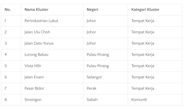 The Ministry of Health has identified 8 new clusters today and 7 are workplace related. Below is the full list of newly identified clusters: