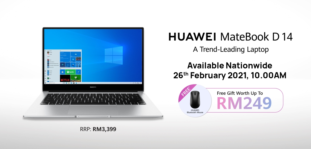 The Huawei MateBook D14 Intel Edition is officially priced at RM3,399 in Malaysia and it will be available from Friday, 26th February 2021 at 10.00am. Buyers will also get a Huawei Bluetooth mouse worth RM249 for free and while stocks last.