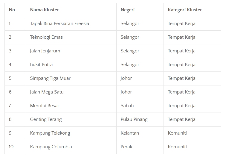 According to the Ministry of Health, there are 10 new clusters identified today and 8 are workplace related. Below is the list of newly identified clusters: