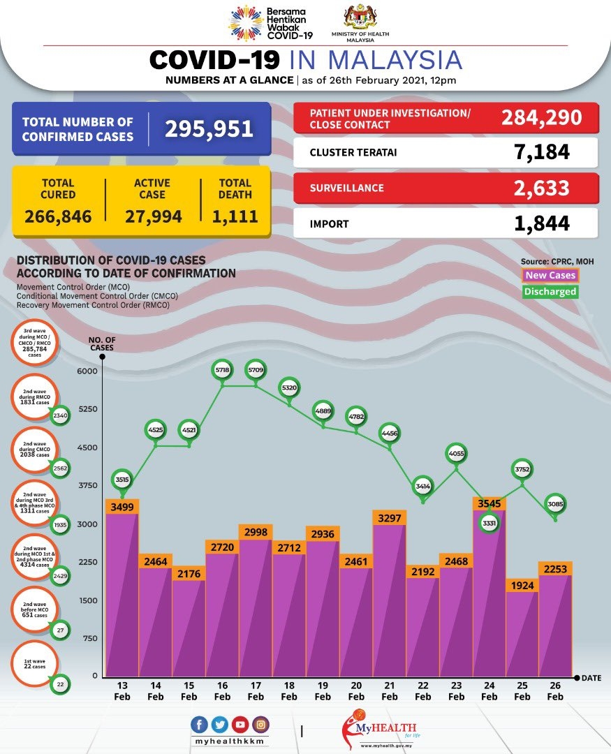 Malaysia has recorded 2,253 new COVID-19 cases today which brings the total number of infections to 295,951. There are 11 new deaths reported and the death toll is now 1,111.