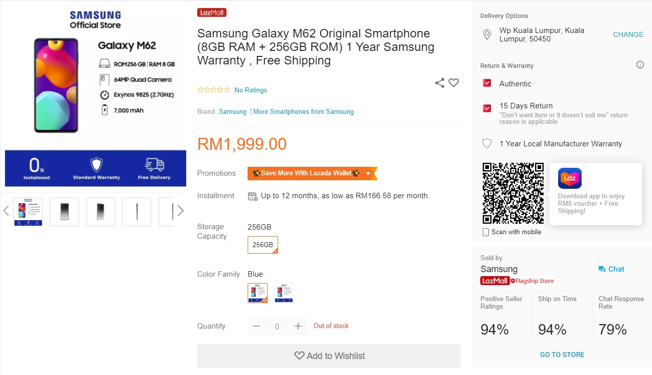 The Galaxy M62 is officially priced at RM1,999 but you can get it for RM1,599 during the 3.3 sale that’s happening this coming Wednesday. It appears to be sold exclusively via the official Samsung online store on Lazada Malaysia.