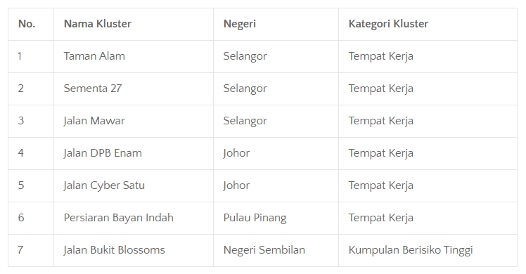The Ministry of Health has identified 7 new clusters and 6 are workplace related. Below is the list of new clusters: