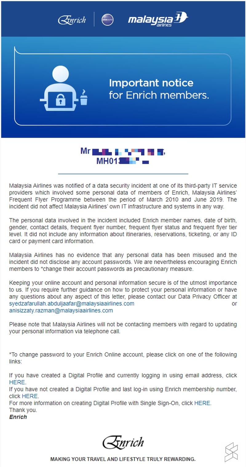Malaysia Airlines has notified that it has a data security incident which reveals personal details of its Enrich members. The flag carrier had sent out an email informing about the security breach to all of its frequent flyer members yesterday evening.