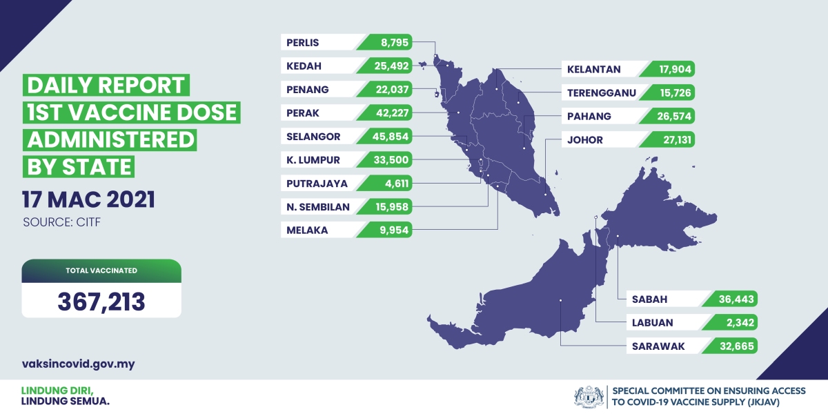 As of yesterday, a total of 367,213 people have received their first dose in Malaysia. Selangor recorded the most vaccination with 45,854 people, followed by Sabah with 36,443 people and Sarawak with 32,665 people.