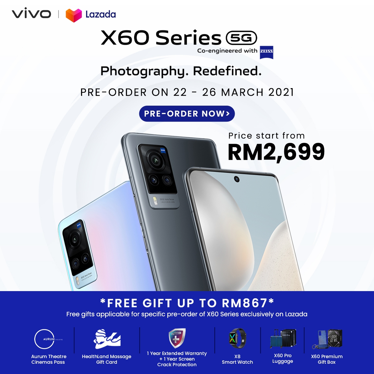Both devices are available in Midnight Black and Shimmer Blue. Pre-order is now available starting from 22nd until 26th March 2021. If you get it via Vivo concept stores, you’ll get Protection Plus which comes with 1-year extended warranty and 1-year screen crack protection for both models. In addition, the X60 also comes with a phone case and thumb drive, while the Pro model gets a travel luggage.