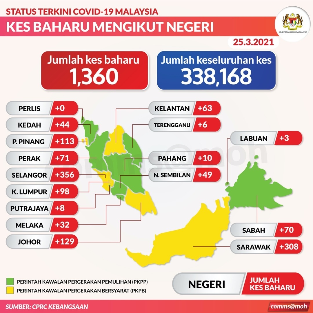 Out of the 1,360 new cases today, 1 is imported while 1,359 are transmitted locally. Selangor recorded the most with 356 cases, followed by Sarawak with 308 cases, Johor with 129 cases and Pulau Pinang with 113 cases.