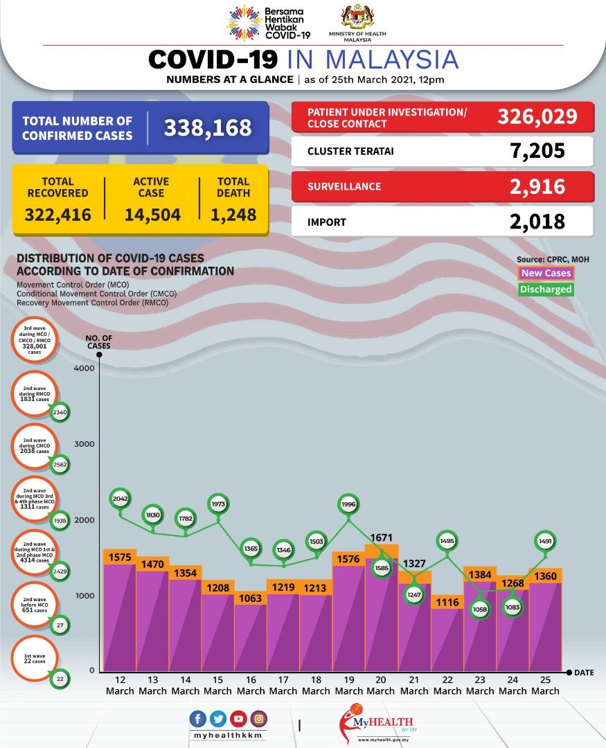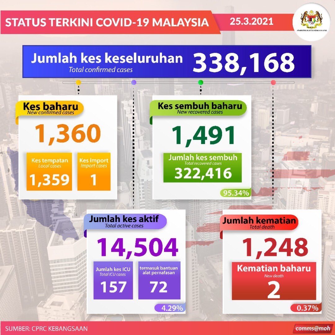 Malaysia has recorded 1,360 new COVID-19 cases today which brings the total number of infections to 338,168. There are 2 new deaths reported and the death toll is now 1,248.
