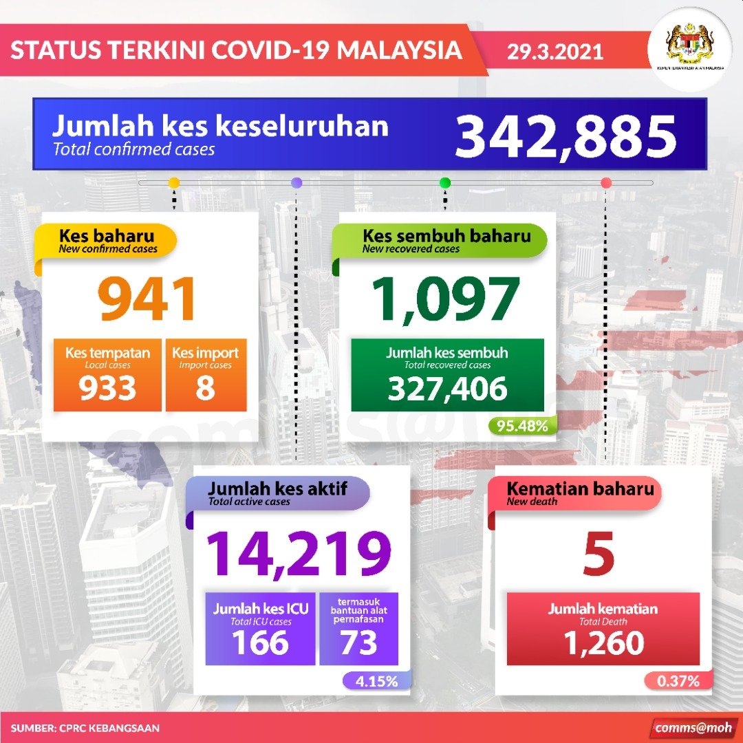 Malaysia has recorded 941 new COVID-19 cases today which brings the total number of infections to 342,885. This is the lowest recorded this year and the last time Malaysia record less than 1,000 cases was 9th December 2020. There are 5 new deaths reported and the death toll is now 1,260.