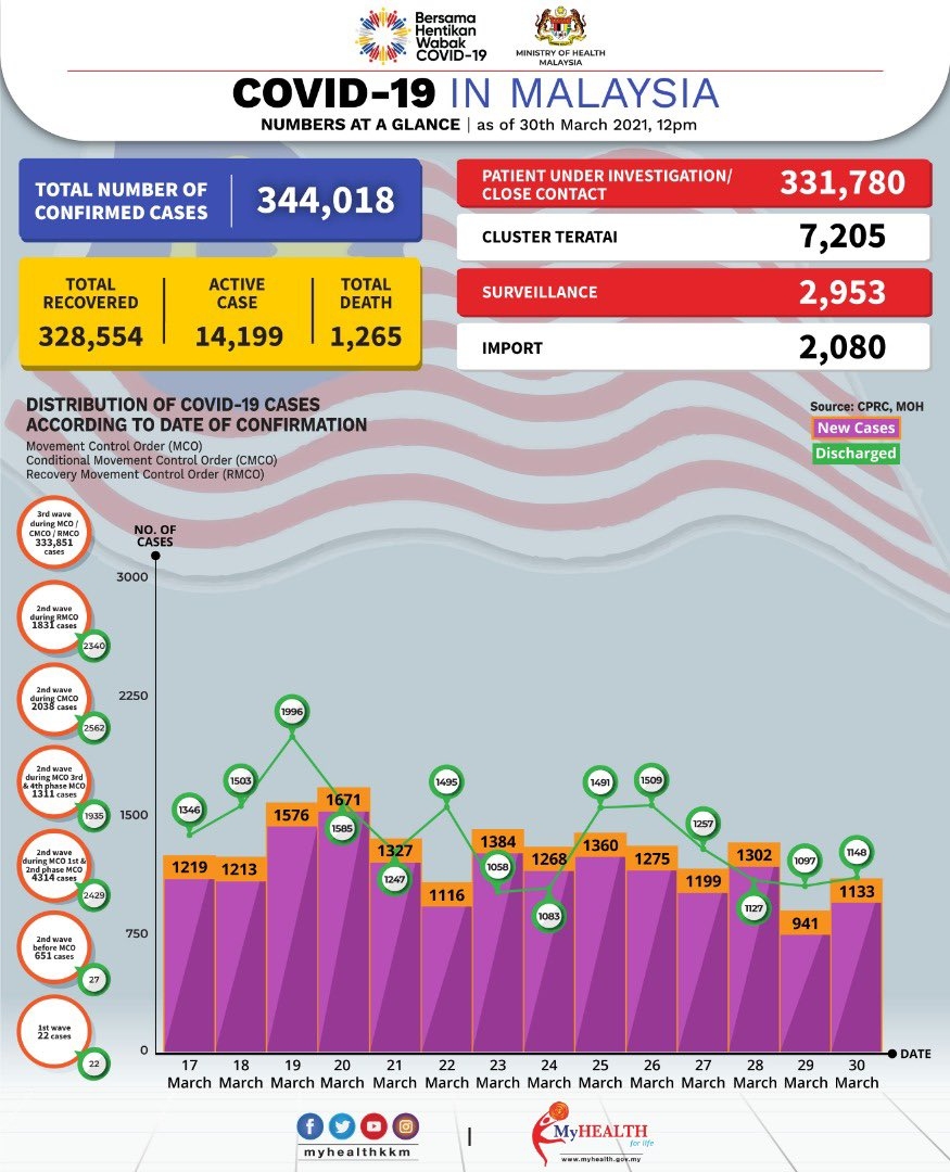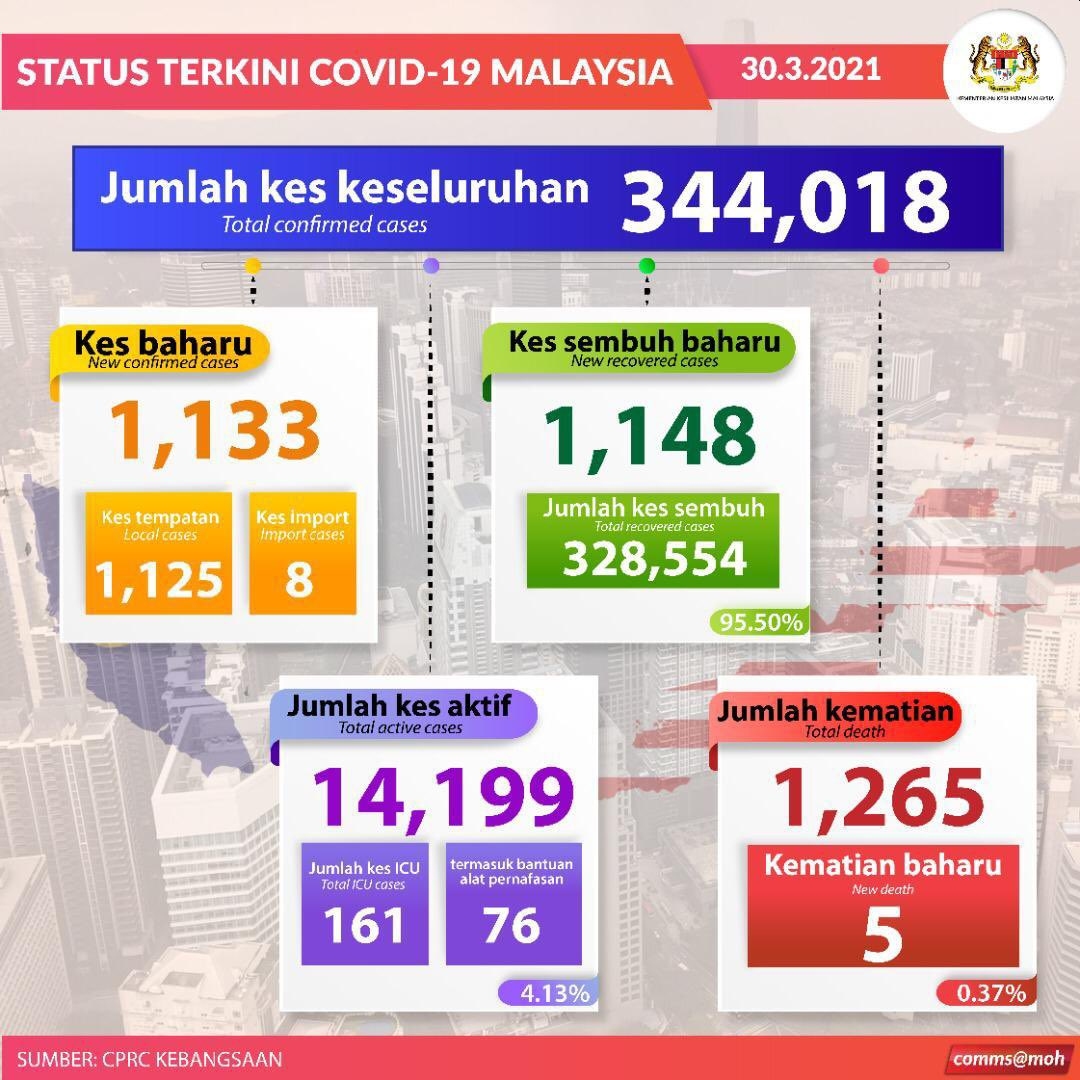 Malaysia has recorded 1,133 new COVID-19 cases today which brings the total number of infections to 344,018. There are 5 new deaths reported and the death toll is now 1,265.