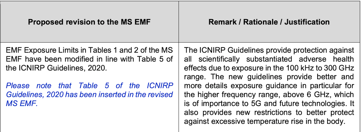 Latest revision of the ISNIRP Guidelines: The International Commission on Non-Ionizing Radiation Protection (ICNIRP) issued their latest guidelines for limiting exposure to electromagnetic fields in March 2020. MCMC wants to reference these guidelines and update the EMF exposure limits.