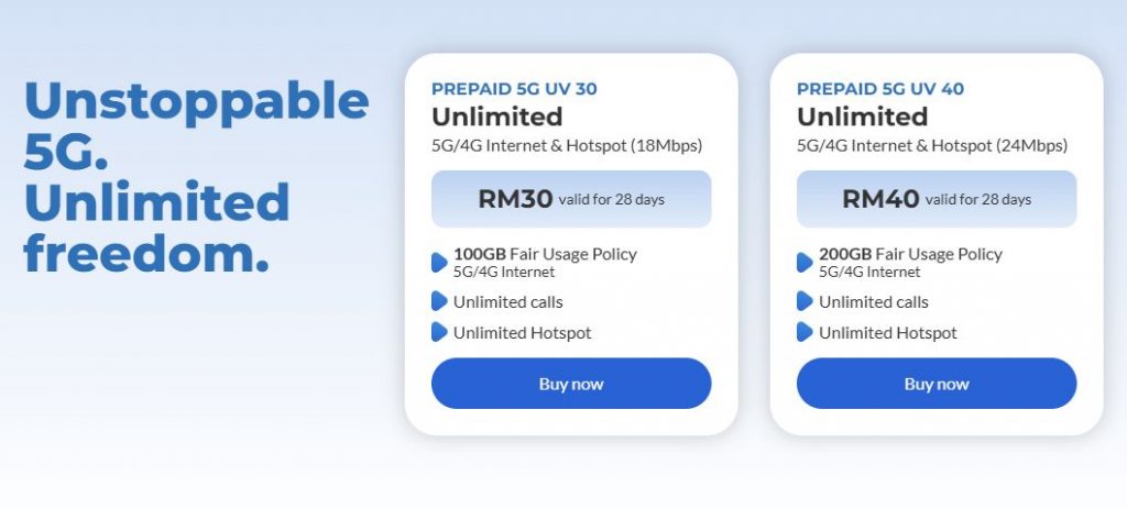 The base Prepaid 5G UV 30 priced at RM30 offers “Unlimited” data capped at 18Mbps and it has a Fair Usage Policy (FUP) of 100GB. Meanwhile, the Prepaid 5G UV 40 option priced at RM40, provides a higher speed cap of 24Mbps and double the FUP data at 200GB.