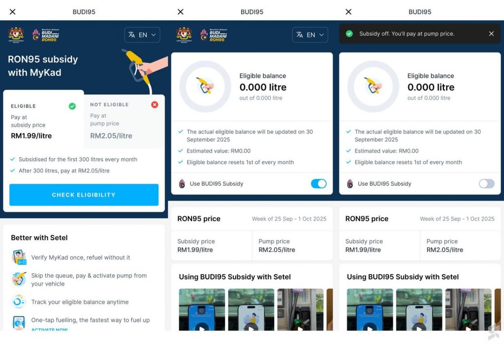 Alternatively, you can also use Setel where you can check your eligibility and remaining quota by tapping on the BUDI95 icon. You are also given the option to turn off and turn on the subsidy.