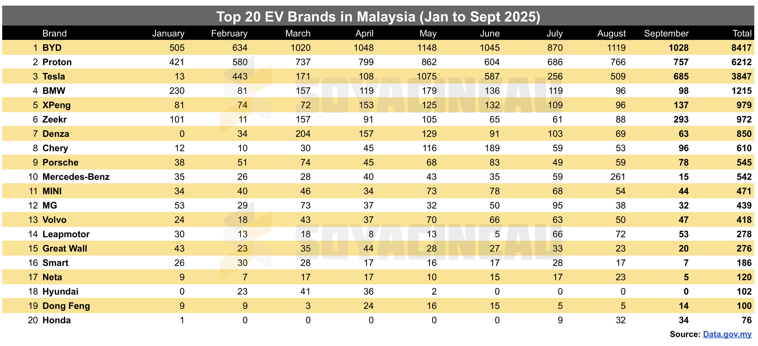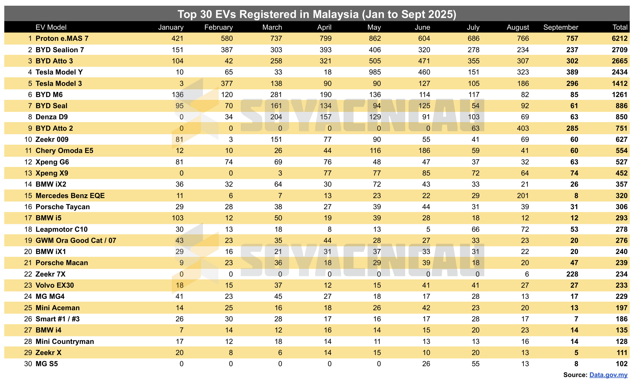 Cumulatively from January to September 2025, Proton e.MAS 7 is still #1 with 6,212 units, followed by the BYD Sealion 7 at #2 with 2,709 units. The BYD Atto 3 sits at #3 spot with 2,665 units, followed by the Tesla Model Y with 2,434 units and Tesla Model 3 with 1,412 units.