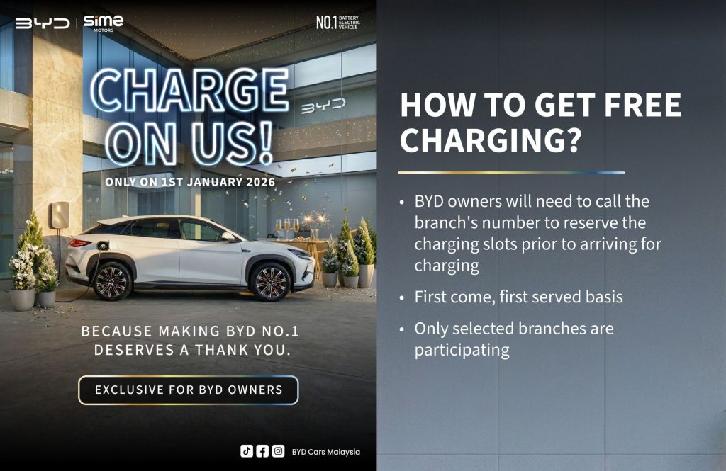 The free charging is given exclusively for BYD owners only and it is applicable at 13 locations nationwide including Sabah.