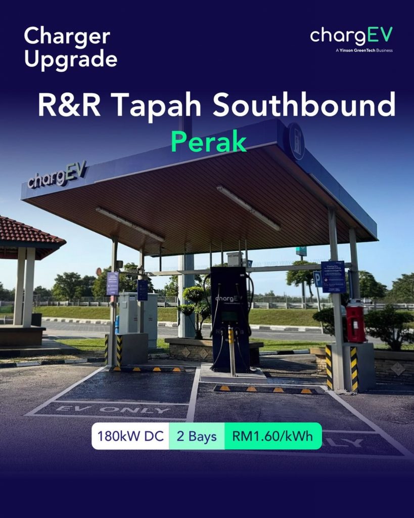 Good news for those who need to charge their EV while travelling southbound between Ipoh and Kuala Lumpur. ChargEV has upgraded their DC Charger at Tapah R&R Southbound from 47kW to 180kW.