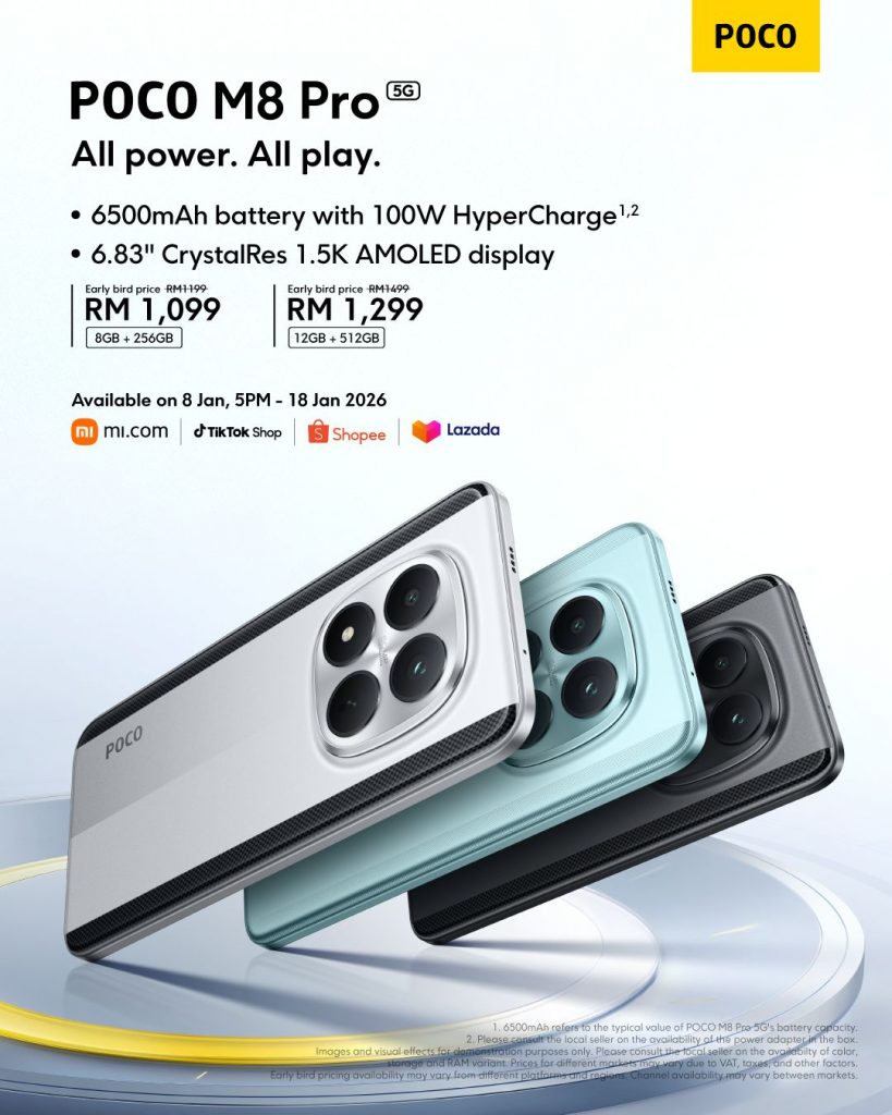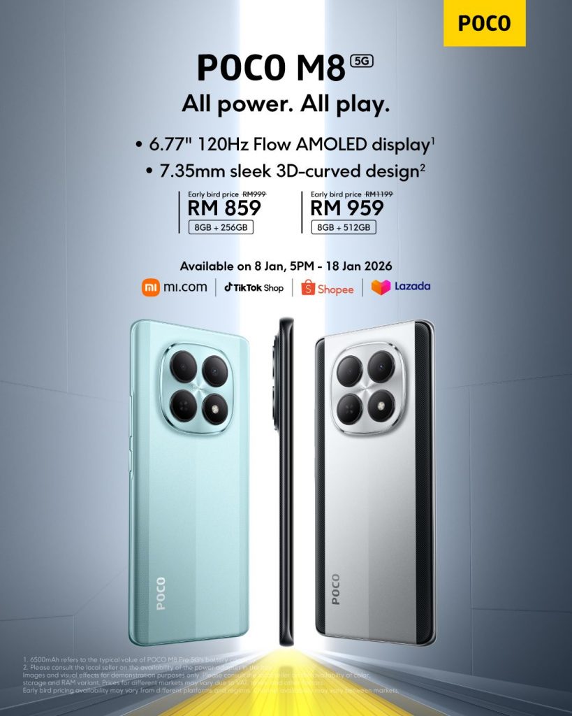 - Poco M8 5G 8GB + 256GB – RM999 (Promo: RM859)