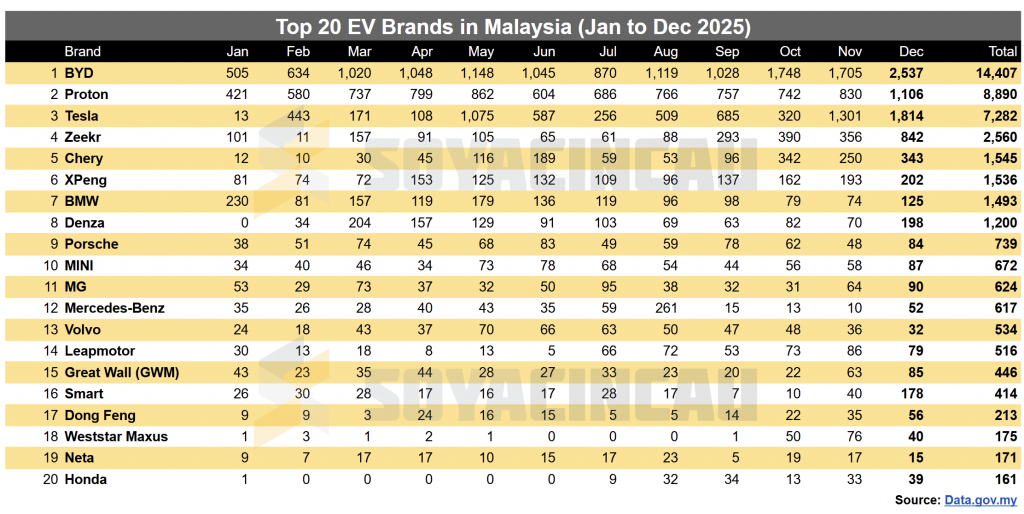 Top 20 EV Brands in Malaysia from January to December 2025
