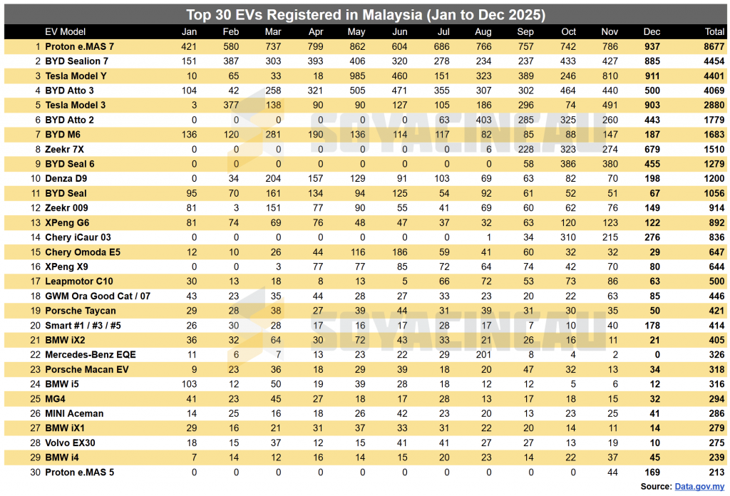 In case you’re wondering, the Perodua QV-E didn’t make the Top 30 list, as it only had 20 registrations last month. In total, there were only 38 registrations for the Perodua EV in 2025.