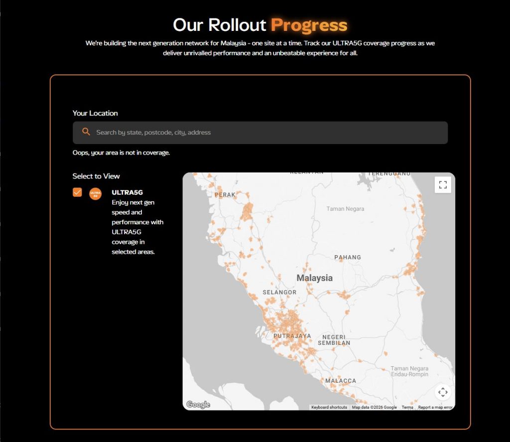 If you want to know if your location is covered by U Mobile’s ULTRA5G network, the orange telco has added a coverage map checker on their website. You can search by entering the name of building, road, state, postcode or city.