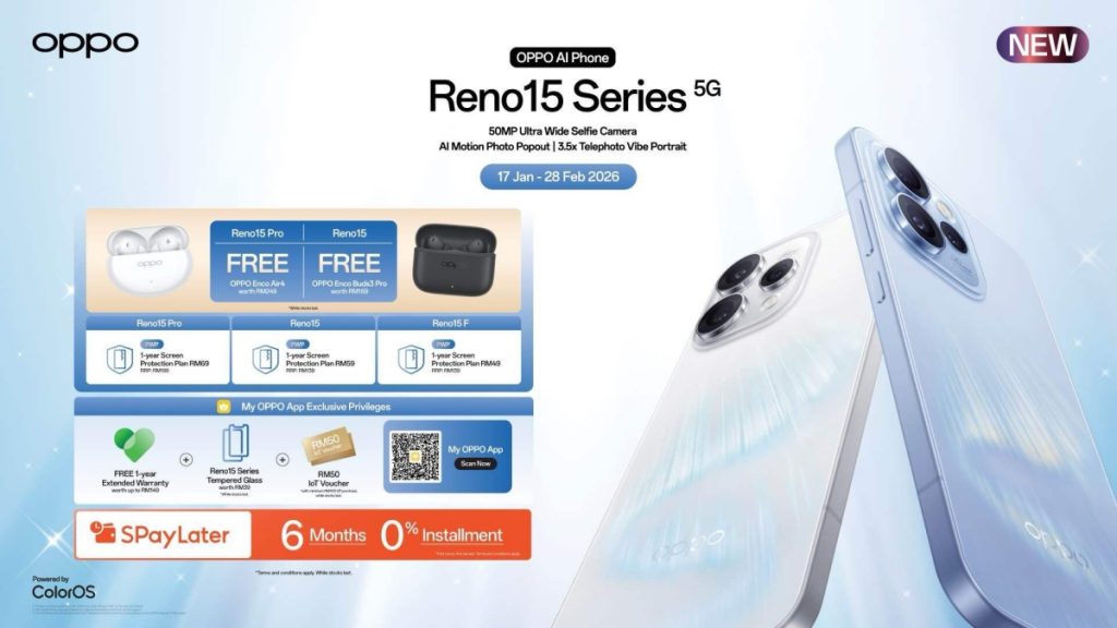 Gifts for early birds include the OPPO Enco Air4 (worth RM249) for the Reno15 Pro and OPPO Enco Buds3 Pro (worth RM169) for the Reno15. For the latest pricing and trade-in details, you can visit the official OPPO Malaysia website.