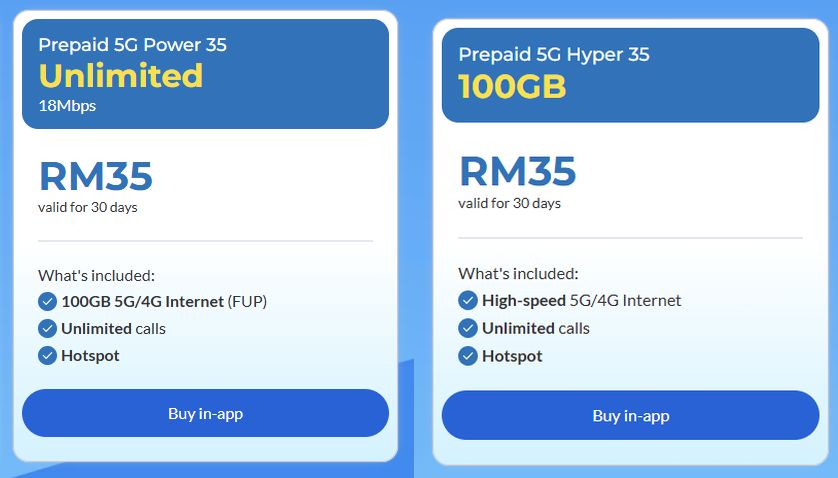 Similar as before, subscribers can choose between high-speed data (Prepaid 5G Hyper) or unlimited (Prepaid 5G Power) offering which starts from RM30/month.