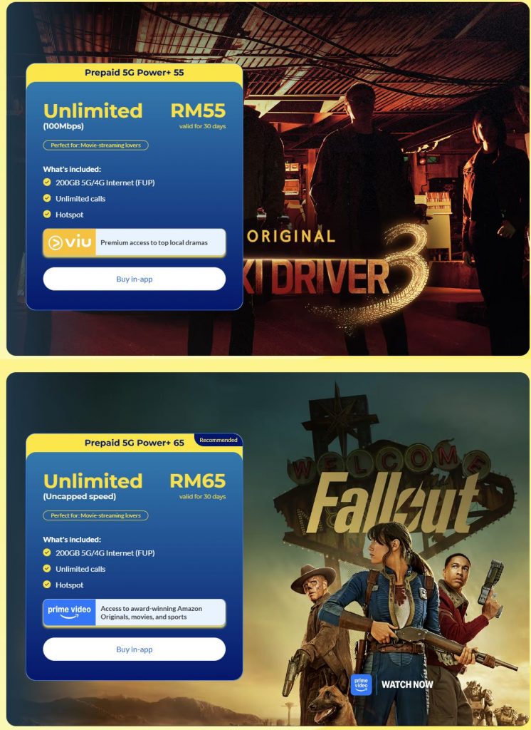 Meanwhile, CelcomDigi Prepaid 5G Power+ 65 at RM65/month bundles Prime Video and it offers “unlimited” data with uncapped speed with a monthly FUP of 200GB.