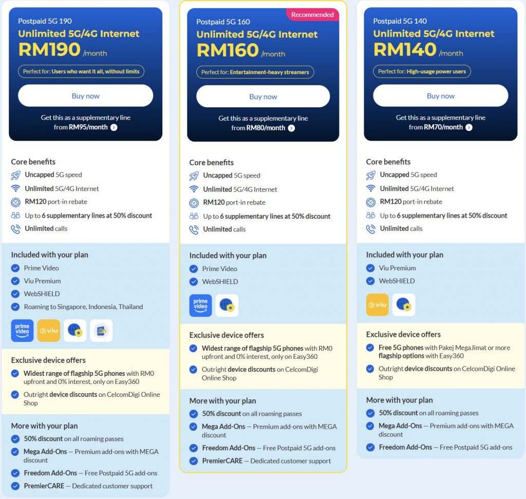 For greater value especially for users who need to add more supplementary lines, CelcomDigi has also introduced higher tier options with more discounts and bundles. All three plans also offer unlimited 5G/4G data with uncapped 5G speeds, along with unlimited voice calls.