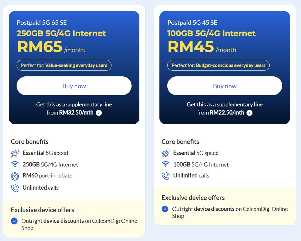 According to CelcomDigi, Postpaid 5G users can select any postpaid plan as their supplementary lines. For cheaper options, there’s Postpaid 5G 45 SE and 65 SE.